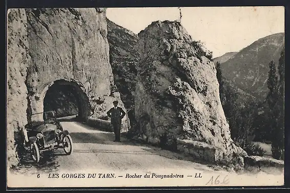 AK Gorges du Tarn, Rocher du Pougnadoires et tunnel avec voiture ancienne