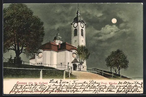 AK Gossau /St. Gallen, Protestantische Kirche bei Mondschein