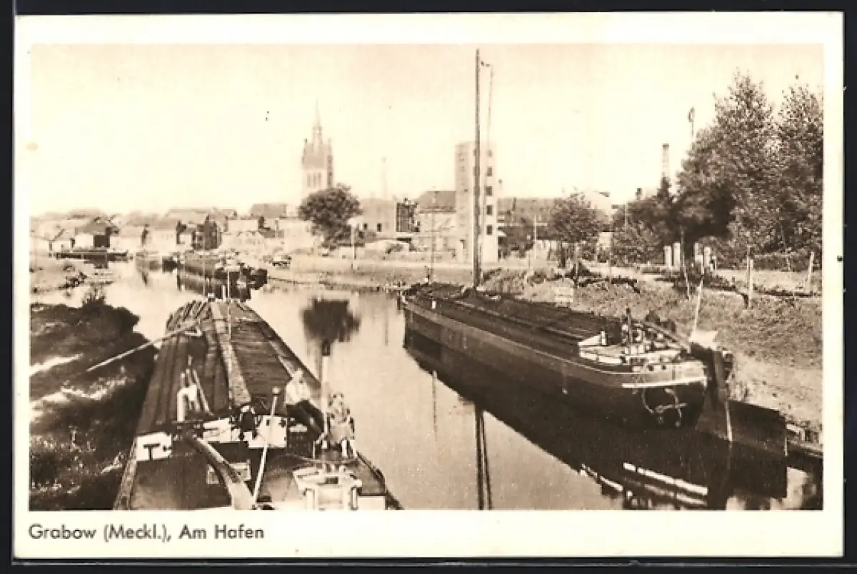 AK Grabow /Meckl., Hafen mit Lastkähnen und Kirche im Hintergrund