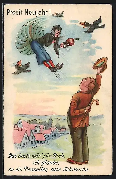 AK Gräfin Zeppelin, Frau hebt mit Propeller am Hintern ab, Mann winkt erfreut zum Abschied, frauenfeindlicher Humor