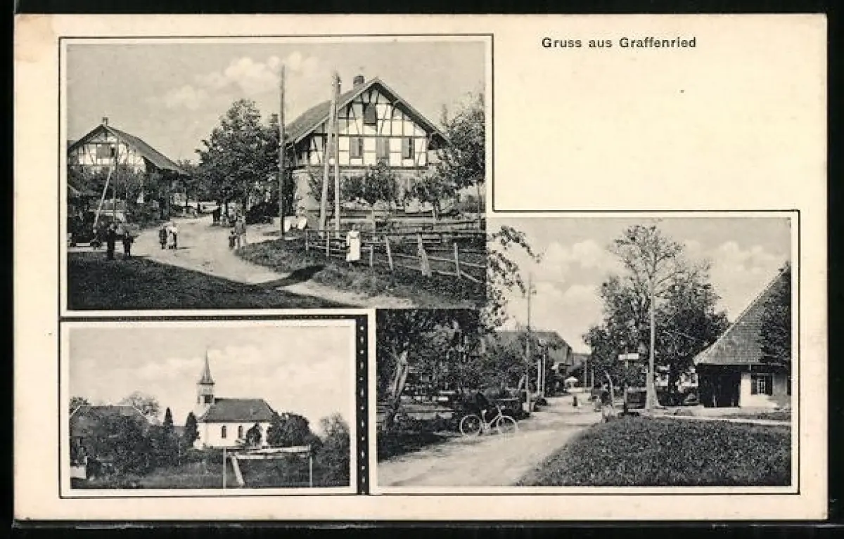 AK Grafenried /BE, Blick zur Kirche, Strassenpartie mit Fachwerkhäusern