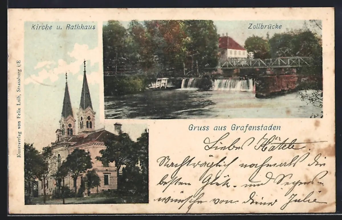 AK Grafenstaden, Kirche u. Rathaus, Zollbrücke