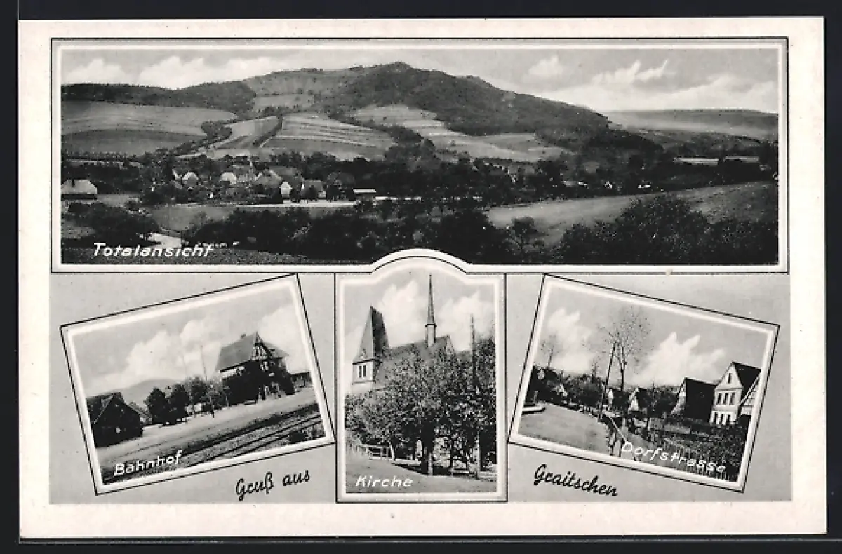 AK Graitschen, Bahnhof, Kirche, Ratskeller, Gesamtansicht