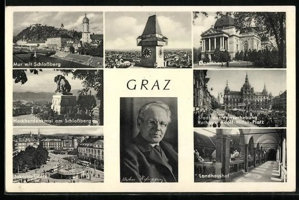 AK Graz, Jakominiplatz, Landhaushof, Portrait Peter Rosegger, Uhrturm