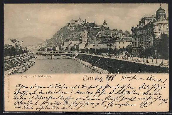 AK Graz, Ortsansicht mit Murquai u. Schlossberg