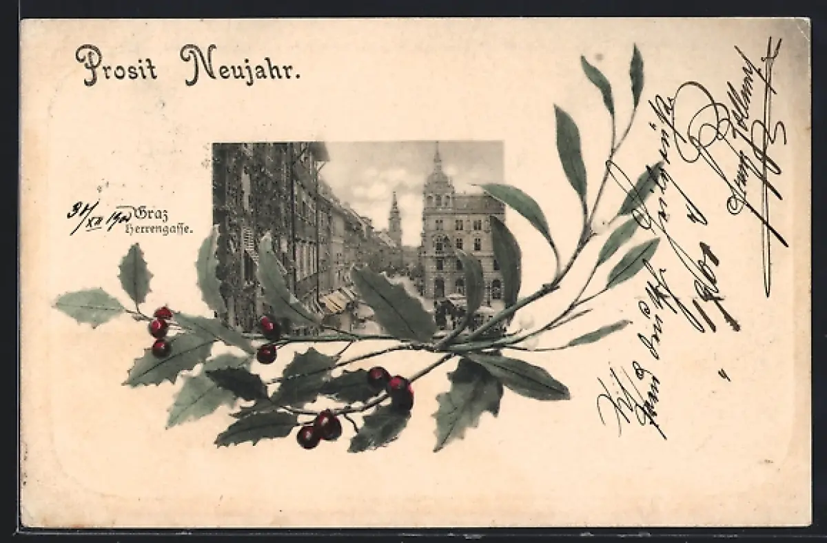 AK Graz, Strasse Herrengasse, Zweig, Neujahrsgruss