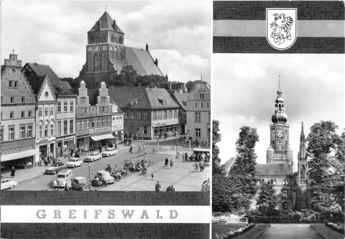 Ansichtskarte Greifswald zwei Abb., gestaltet Erhaltung II, Beförderungsspuren postalisch gelaufen, gestempelt: 23.5.67 Druckvermerk: 1966 Herstellungsland: DDR Verlag: Gebr. Garloff KG, Magdeburg - Z3514