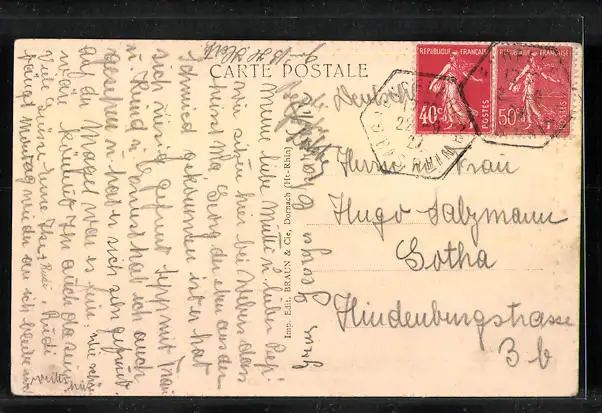 Personenbezogene Daten auf der Rückseite der Karte wurden durch blauen Textmarker unkenntlich gemacht. Die blauen Stellen sind auf die Vorderseite durchgeweicht und wirken sich negativ auf das Postkartenfoto aus