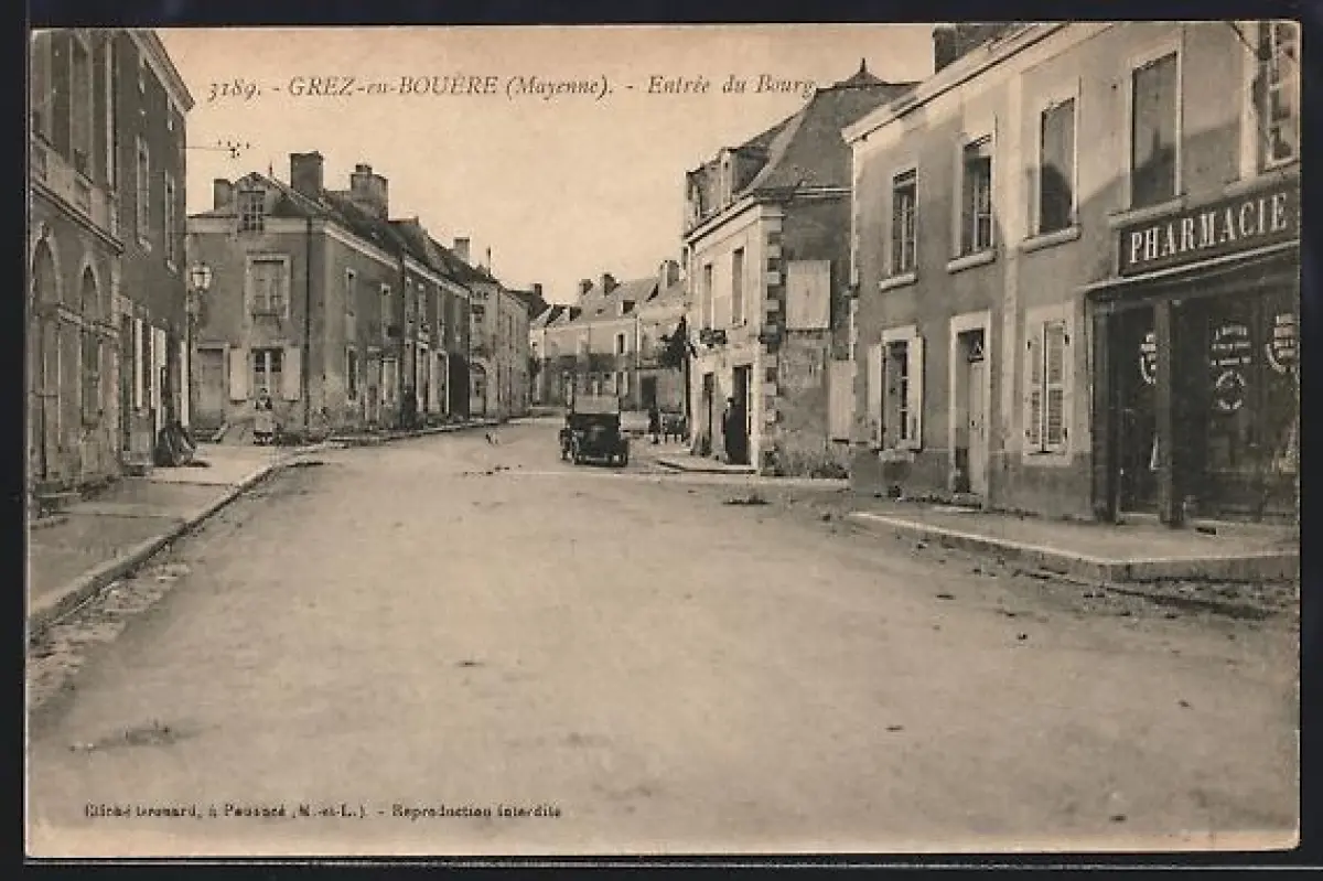 AK Grez-en-Bouère /Mayenne, Entrée du Bourg avec pharmacie et voitures sur la rue principale