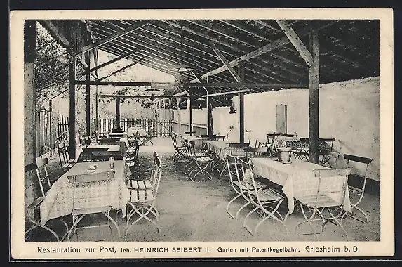 AK Griesheim b. D., Restauration zur Post, Inh. Heinrich Seibert II., Garten mit Patentkegelbahn