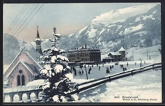 AK Grindelwald, Ortspartie mit Kirche im Winter