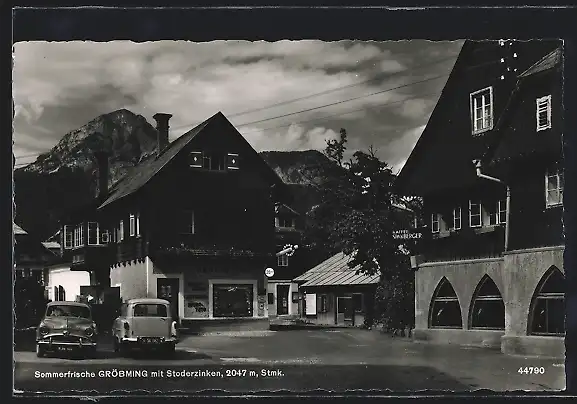 AK Gröbming, Strassenpartie mit Cafe Spanberger, Geschäft von Karl Rappl und Stoderzinken