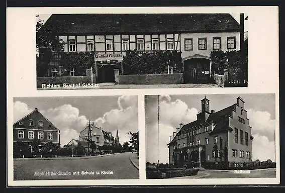 AK Gröditz, Richters Gasthof Gröditz, Strasse mit Schule und Kirche, Blick zum Rathaus