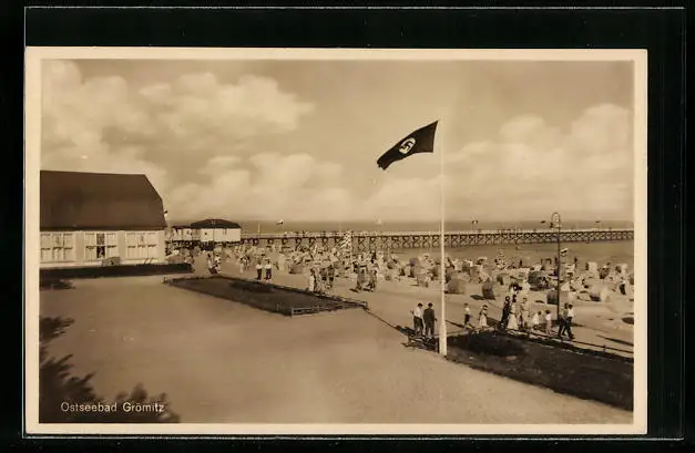 AK Grömitz / Ostseebad, Strand mit Seebrücke und flagge