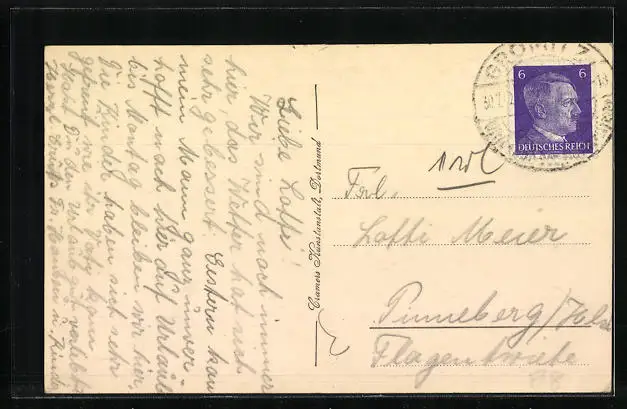 Personenbezogene Daten auf der Rückseite der Karte wurden durch blauen Textmarker unkenntlich gemacht. Die blauen Stellen sind auf die Vorderseite durchgeweicht und wirken sich negativ auf das Postkartenfoto aus
