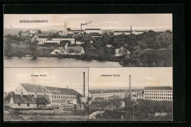 AK Gross-Siegharts, Zuleger- und Adensamer-Fabrik, Totalansicht mit Gewässer
