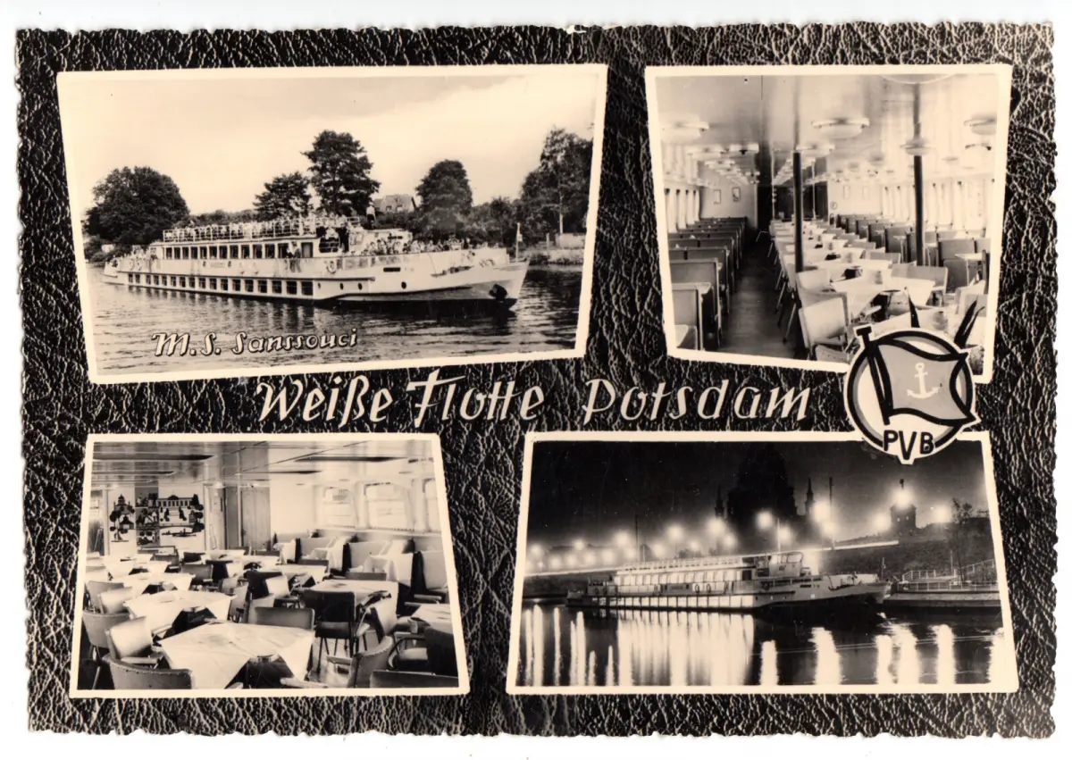 Fotokarte im Großformat 21 x 15 cm Potsdam Weiße Flotte, vier Abb., gestaltet Erhaltung I-II ungelaufen Druckjahr: um 1960 Herstellungsland: DDR Verlag: Foto-Studio Potsdam Der