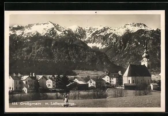 AK Grossgmain, Ortsansicht mit der Kirche, Blick auf das Lattengebirge