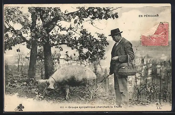 AK Groupe sympathique cherchant la Truffe, Sammler mit seinem Trüffelschwein