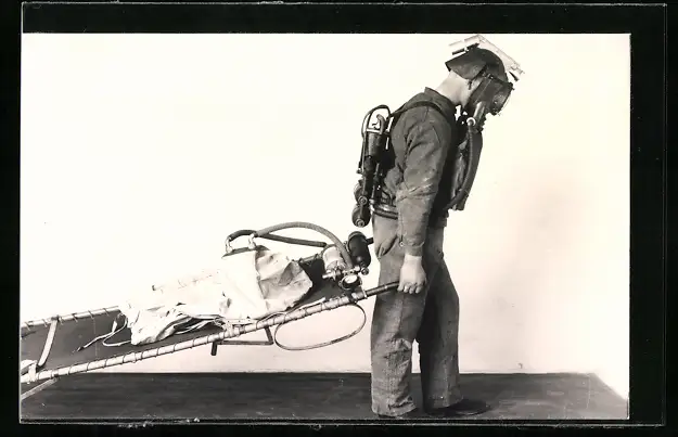 AK Grubenwehrmann mit Gasschutzgerät und Trage