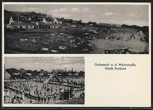AK Grünstadt a. d. Weinstrasse, Städtisches Freibad an einem Sommertag