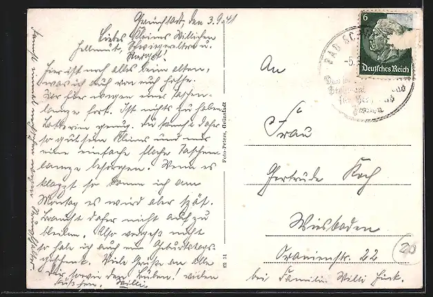gelaufen 1941, Briefmarke entfernt, rückseitig Klebe- und Papierreste, guter Zustand