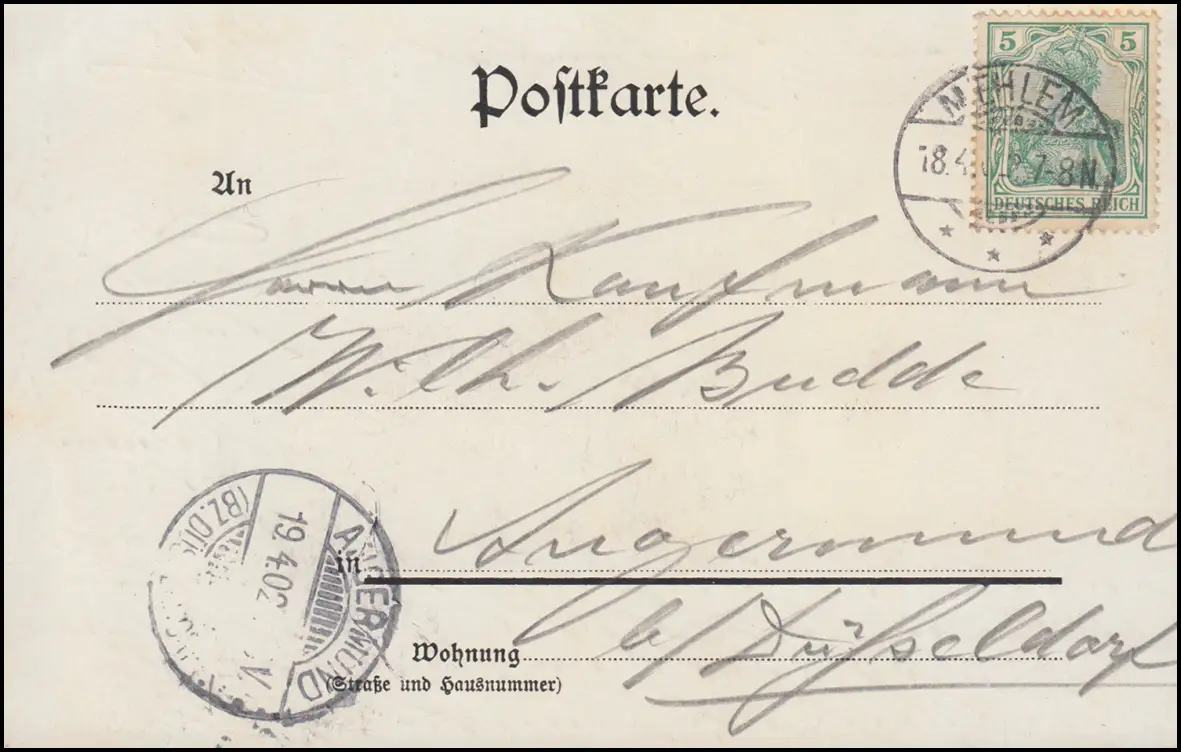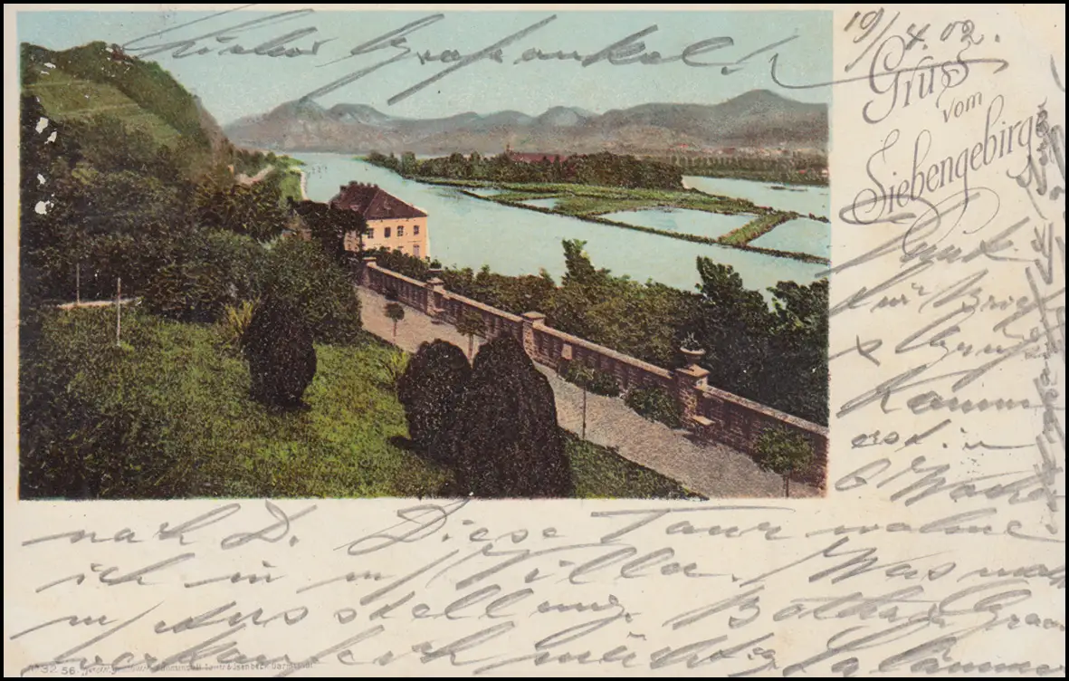 AK Gruss vom Siebengebirge, MEHLEM 18.4.1902 nach ANGERMÜND 19.4.02