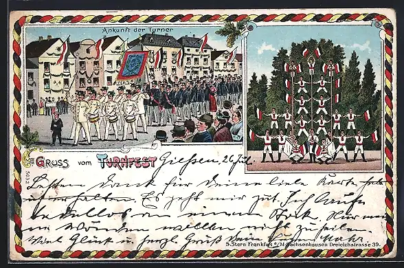 AK Gruss vom Turnfest, Ankunft der Turner, Pyramide