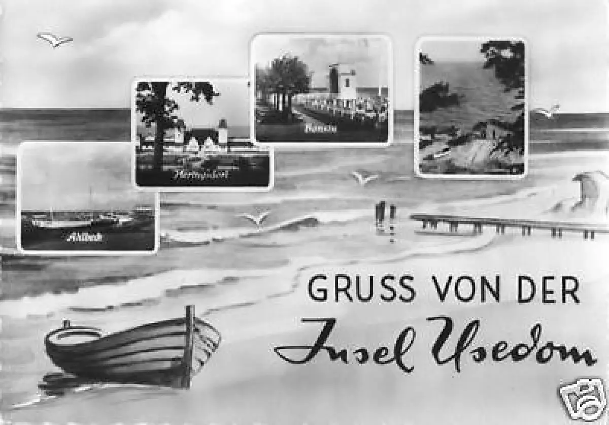 Ansichtskarte Gruß von der Insel Usedom vier Abb., gestaltet Erhaltung II, rückseitig etwas fleckig postalisch gelaufen, ungestempelt: Druckvermerk: 1958 Herstellungsland: DDR Verlag: Graphokopie H. Sander, Berlin - G4