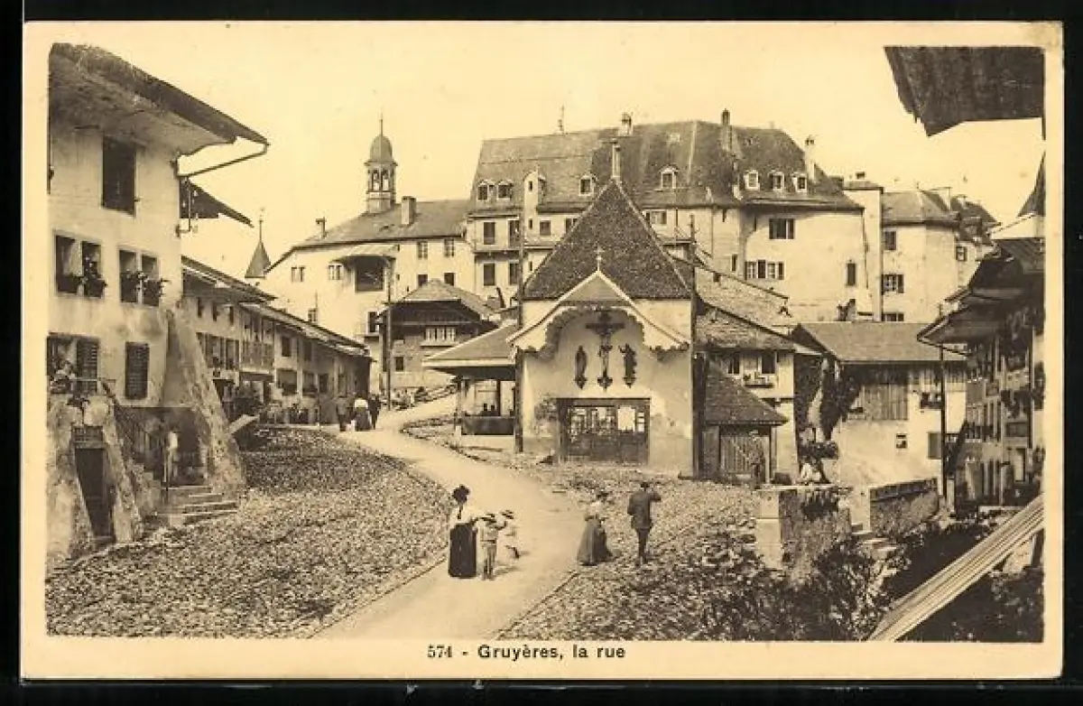 AK Gruyères, La Rue, Strassenpartie im Ortskern