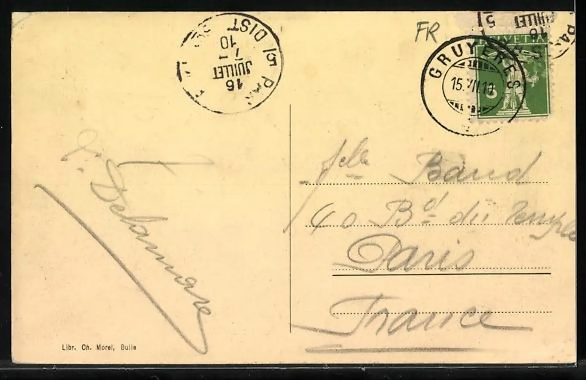 Personenbezogene Daten auf der Rückseite der Karte wurden durch blauen Textmarker unkenntlich gemacht. Die blauen Stellen sind auf die Vorderseite durchgeweicht und wirken sich negativ auf das Postkartenfoto aus