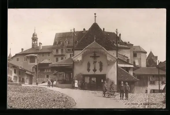 AK Gruyères, Strassenpartie mit Kirche
