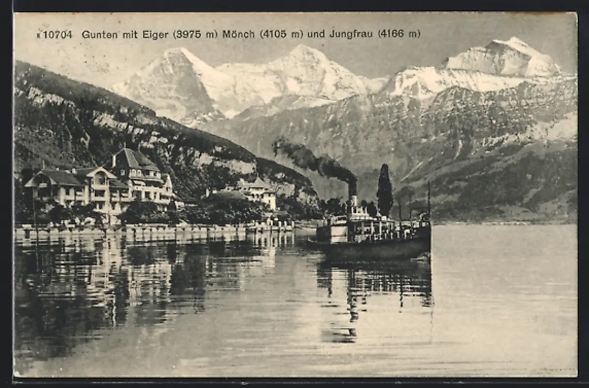 AK Gunten, Uferpartie mit Dampfer, Eiger, Mönch und Jungfrau