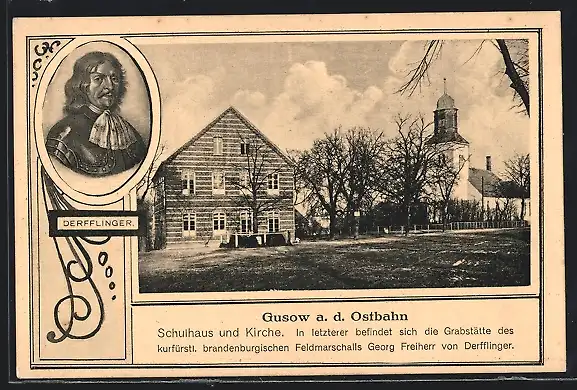 AK Gusow a. d. Ostbahn, Schulhaus und Kirche mit Grabstätte des Feldmarschalls Georg Freiherr von Derfflinger