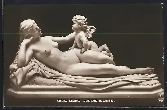 AK Gustav Crauk: Jugend und Liebe, Skulptur eines nackten Mädchens mit einem kleinen Engel, liegender Frauenakt