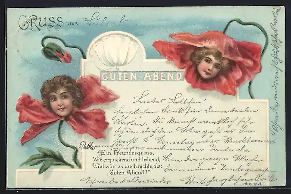 AK Guten Abend, Mohnblumen mit Frauengesichtern, Metamorphose