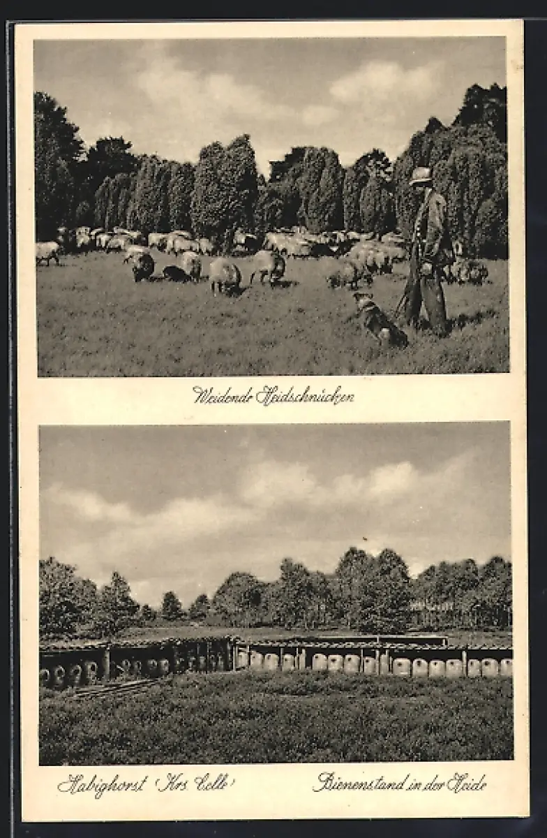 AK Habighorst, weidende Heidschnucken, Bienenstand in der Heide