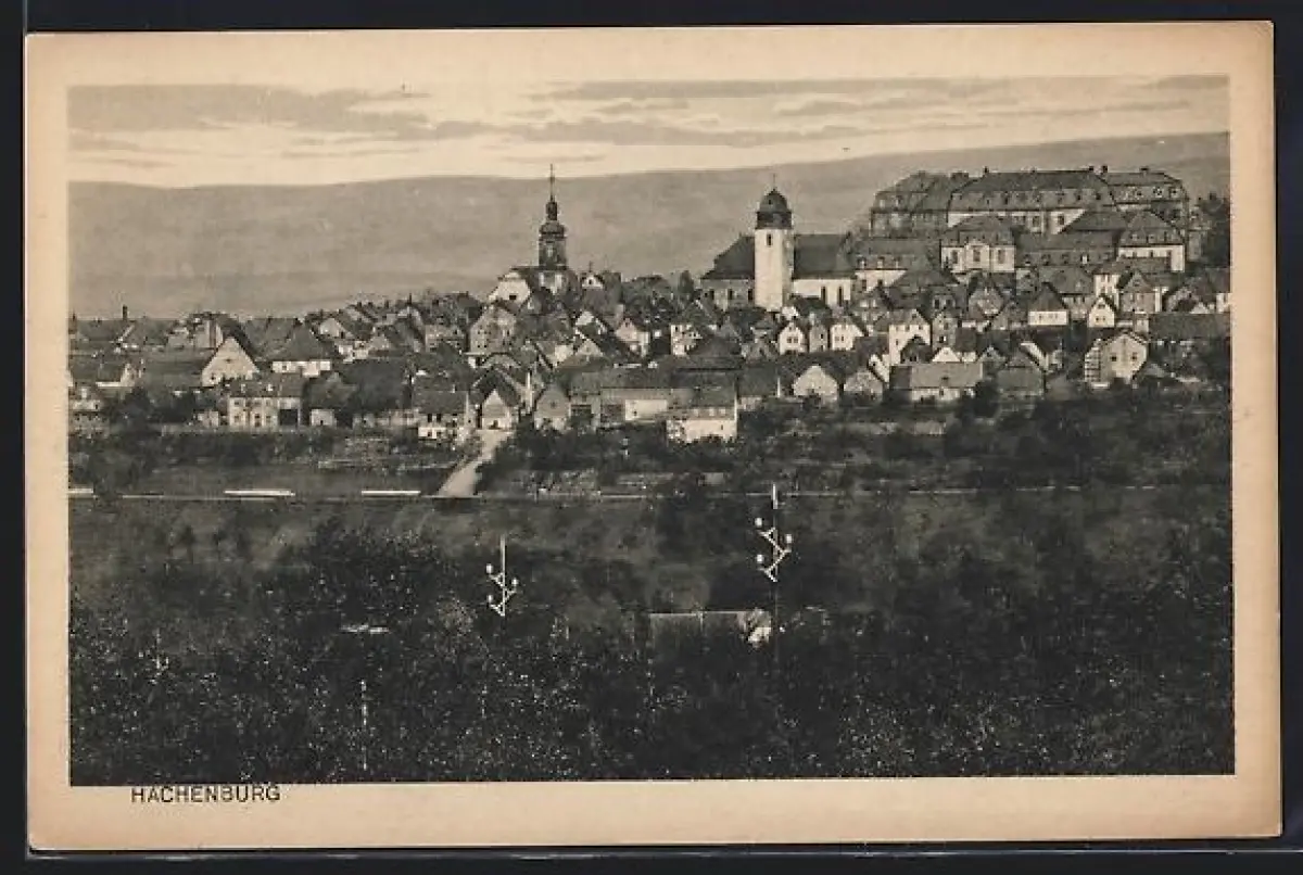 AK Hachenburg, Gesamtansicht der Stadt mit Kirchturm