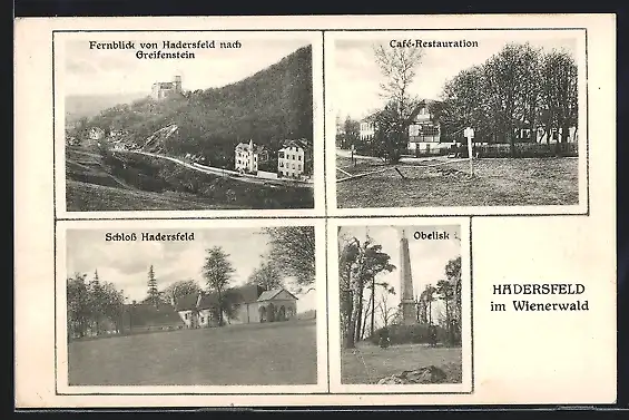 AK Hadersfeld /Wienerwald, Café-Restauration, Fernblick von Hadersfeld nach Greifenstein, Obelisk