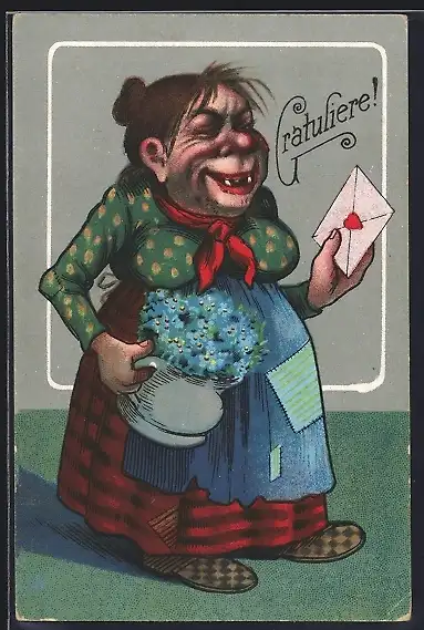 AK Hässliche Frau mit einem Liebesbrief und Vergissmeinnicht, frauenfeindlicher Humor