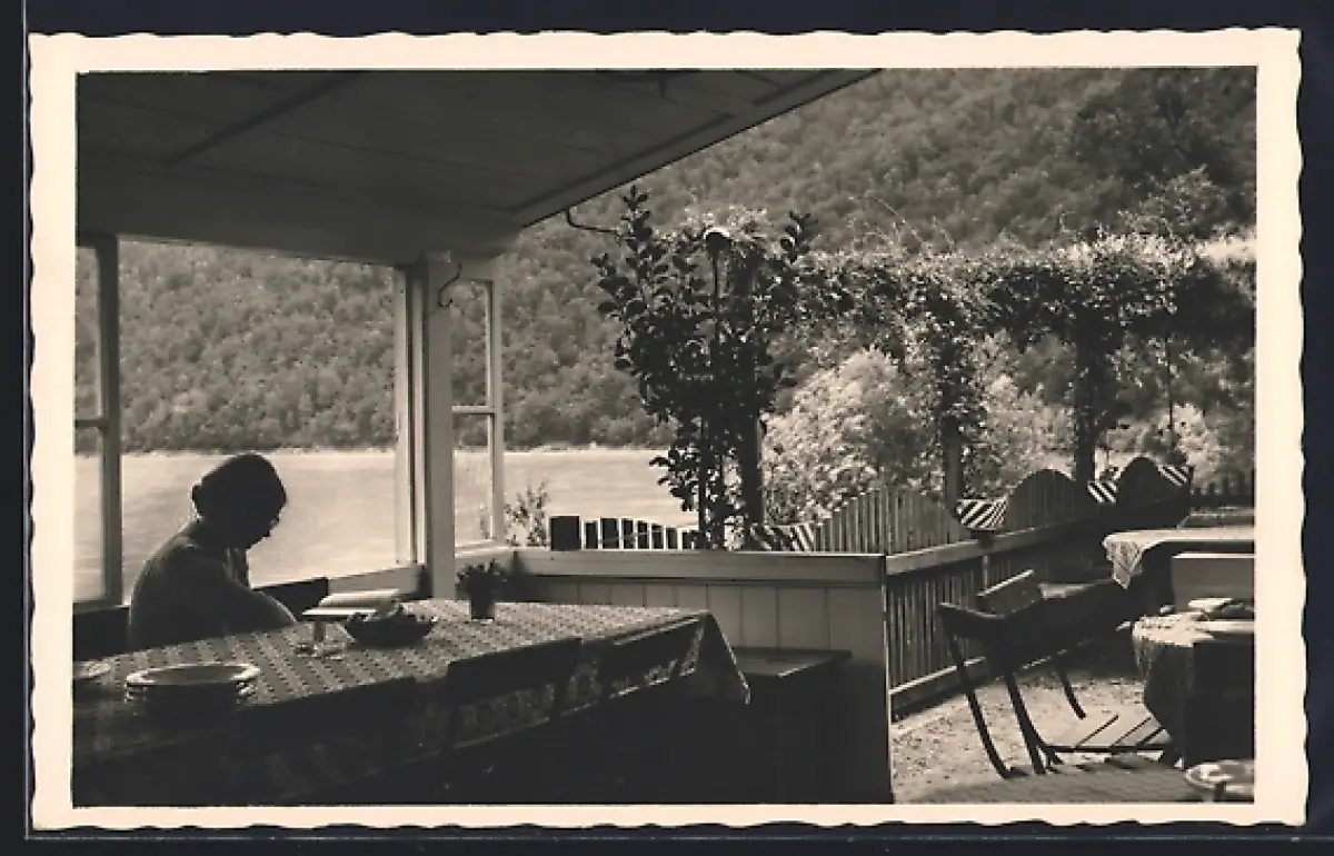 AK Haibach ob der Donau, Schlögen a. d. Donau, Gasthaus M. Gugler, Terrasse mit Leserin