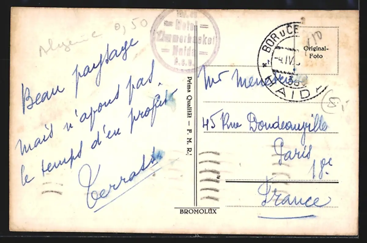 Personenbezogene Daten auf der Rückseite der Karte wurden durch blauen Textmarker unkenntlich gemacht. Die blauen Stellen sind auf die Vorderseite durchgeweicht und wirken sich negativ auf das Postkartenfoto aus