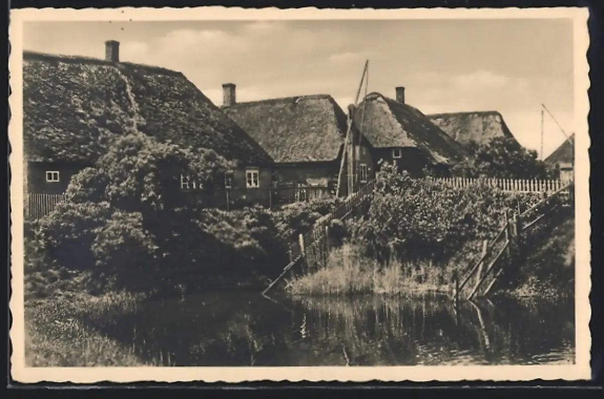 AK Hallig Hooge, Reetgedeckte Häuser am Wasser