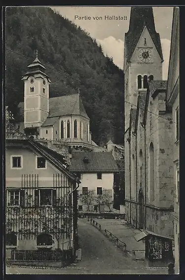 AK Hallstatt, Strassenpartie mit Kirchen