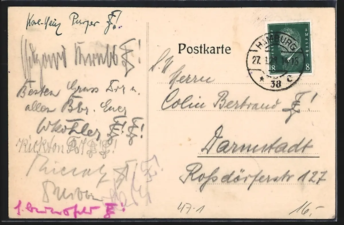Personenbezogene Daten auf der Rückseite der Karte wurden durch blauen Textmarker unkenntlich gemacht. Die blauen Stellen sind auf die Vorderseite durchgeweicht und wirken sich negativ auf das Postkartenfoto aus
