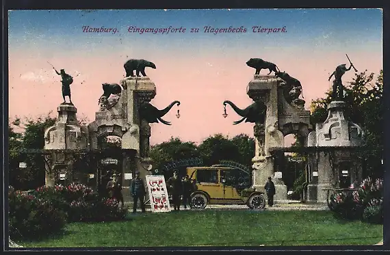 AK Hamburg, Eingangspforte zu Hagenbecks Tierpark mit Auto