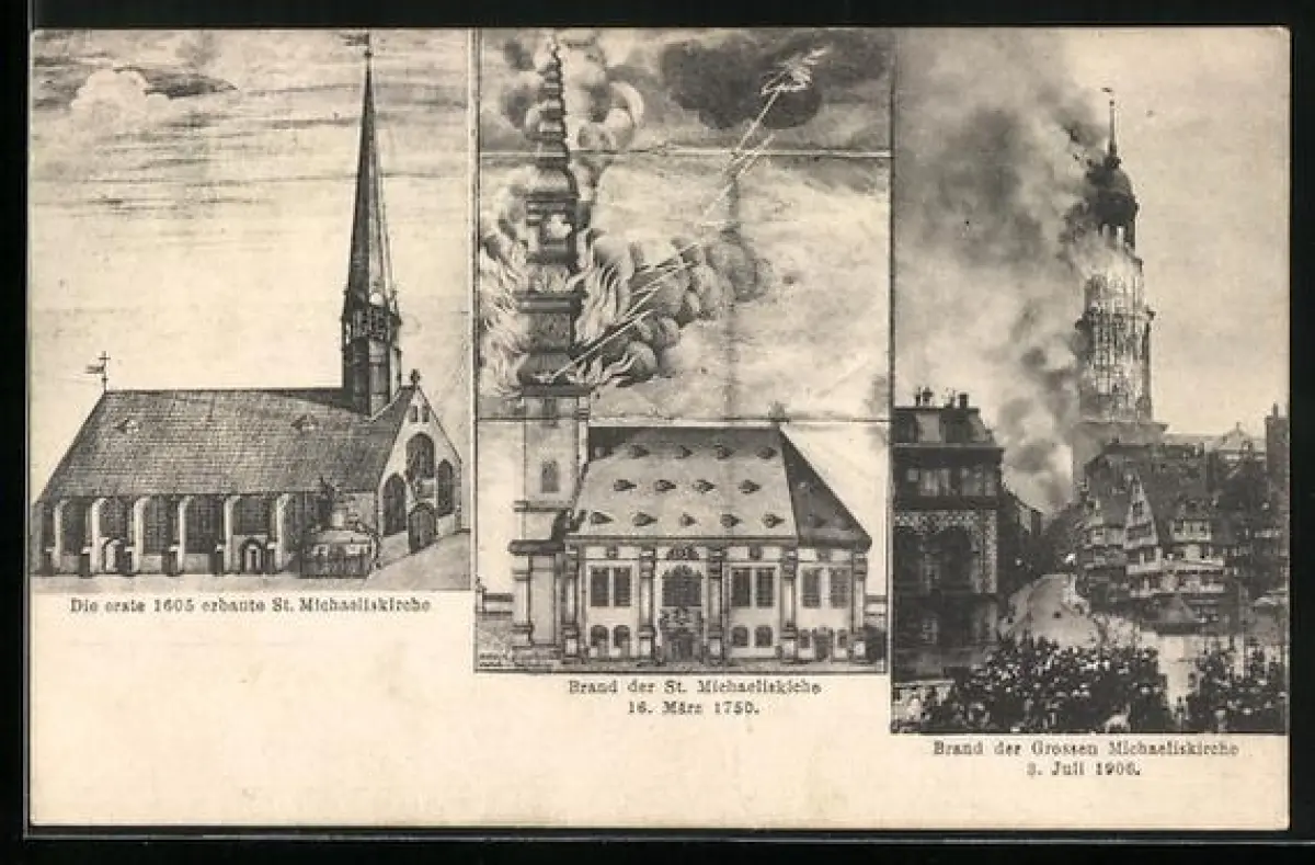 AK Hamburg-Neustadt, 1. 1605 erbaute St. Michaeliskirche, Brand 1750, Brand der Grossen Michaeliskirche1906