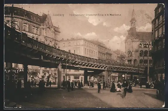 AK Hamburg-Neustadt, Rödingemarkt-Graskeller-Ecke mit Hochbahn
