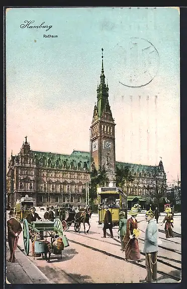 AK Hamburg, Rathaus mit Strassenbahn und Anwohnern