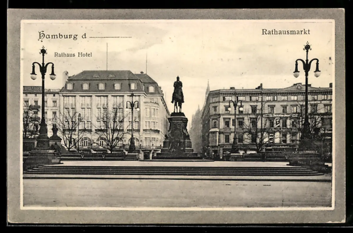 AK Hamburg, Rathausmarkt, Rathaus Hotel, Reiterstandbild